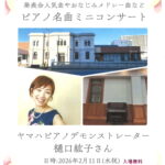 ヤマハピアノデモンストレーター樋口紘子さんのミニコンサートです 発表会人気曲やおなじみのメドレー曲などを演奏し… 続きを読む: ピアノ名曲ミニコンサート - ヤマハ音楽教室・ヤマハ英語教室2026春開講予定